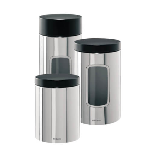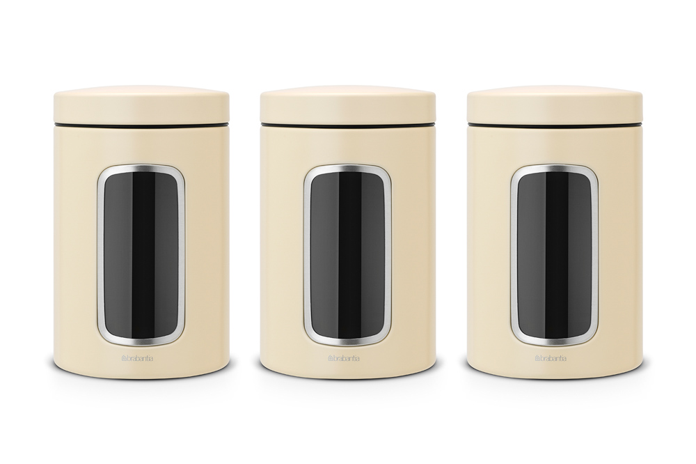 Організувати ідеальний порядок в кухонних шафках сучасної господині допоможе набір контейнерів для зберігання сипучих продуктів від Brabantia. Три практичні та зручні ємності унікальні тим, що мають невеликі віконця, завдяки яким ви завжди будете бачити, що і в якій кількості міститься в банку. Антистатична поверхня запобігає прилипання сипучих продуктів до внутрішньої частини віконця. Спеціальна замикається кришка не пропускає запах, довго зберігаючи аромат і свіжість продуктів. Контейнер виготовлений з антикорозійного сталі із захисним алюмінієво-цинковим покриттям і легко чиститься завдяки гладкій внутрішній поверхні. Контейнер Brabantia об'ємом 1,4 л вміщує 500 г кави або 1 кг цукру. Підстава з захисним покриттям. 10-річна гарантія Brabantia.