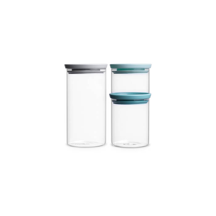 Набір модульних ємностей для зберігання сипучих продуктів Brabantia допоможе вам навести порядок на кухні і запросто знаходити потрібні інгредієнти. Скляні банки не вбирають аромати і легко миються навіть в посудомийній машині. Кришка з пластику щільно прилягає до скла, що створює вакуум, за рахунок цього аромат і смак вмісту буде зберігатися довше. Дизайн модульних банок дозволяє ставити одну ємність на іншу, економити місце на полицях і надійно зберігати крупи, цукор, макарони та інші сипучі продукти. Об'єм ємностей - 0,3 / 0,7 / 1 л..