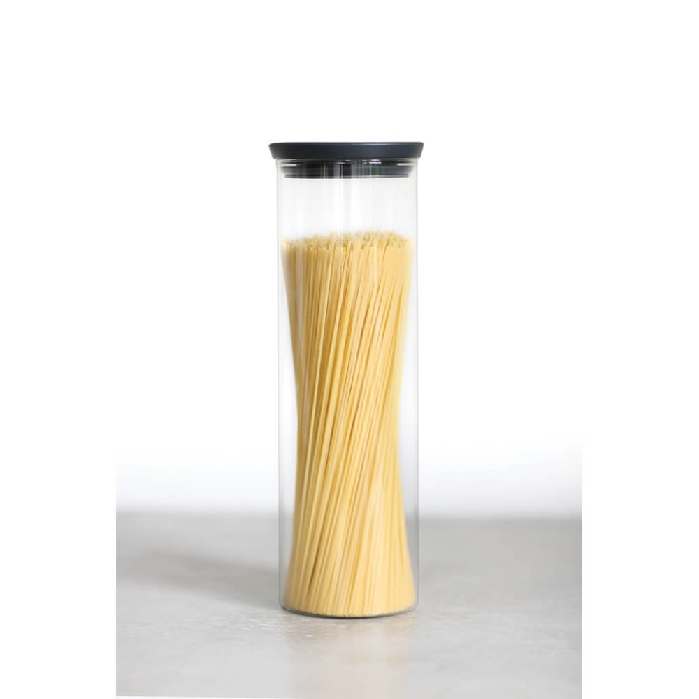 Модульна ємність для зберігання сипучих продуктів Brabantia допоможе вам навести порядок на кухні і запросто знаходити потрібні інгредієнти. Вертикальна форма ідеально підійде для зберігання спагетті і інших видів пасти. Скляна банка не вбирає аромати і легко миється навіть в посудомийній машині. Кришка з пластику щільно прилягає до скла, що створює вакуум, за рахунок цього аромат і смак вмісту буде зберігатися довше. Дизайн модульних банок дозволяє ставити одну ємність на іншу, економити місце на полицях і надійно зберігати крупи, цукор, макарони та інші сипучі продукти. Об'єм ємності — 1,9 л.