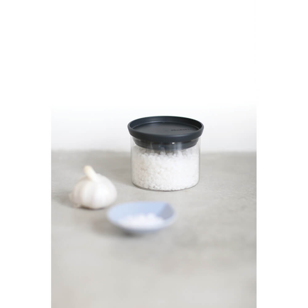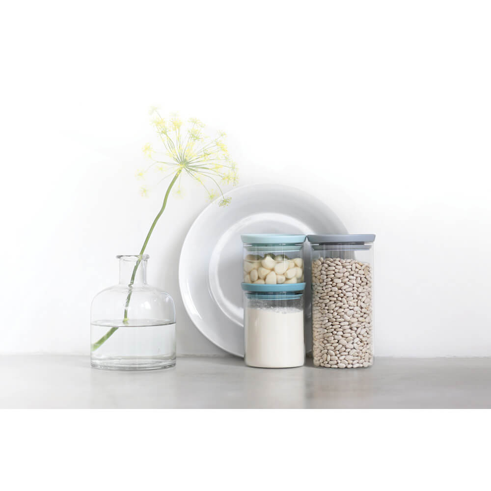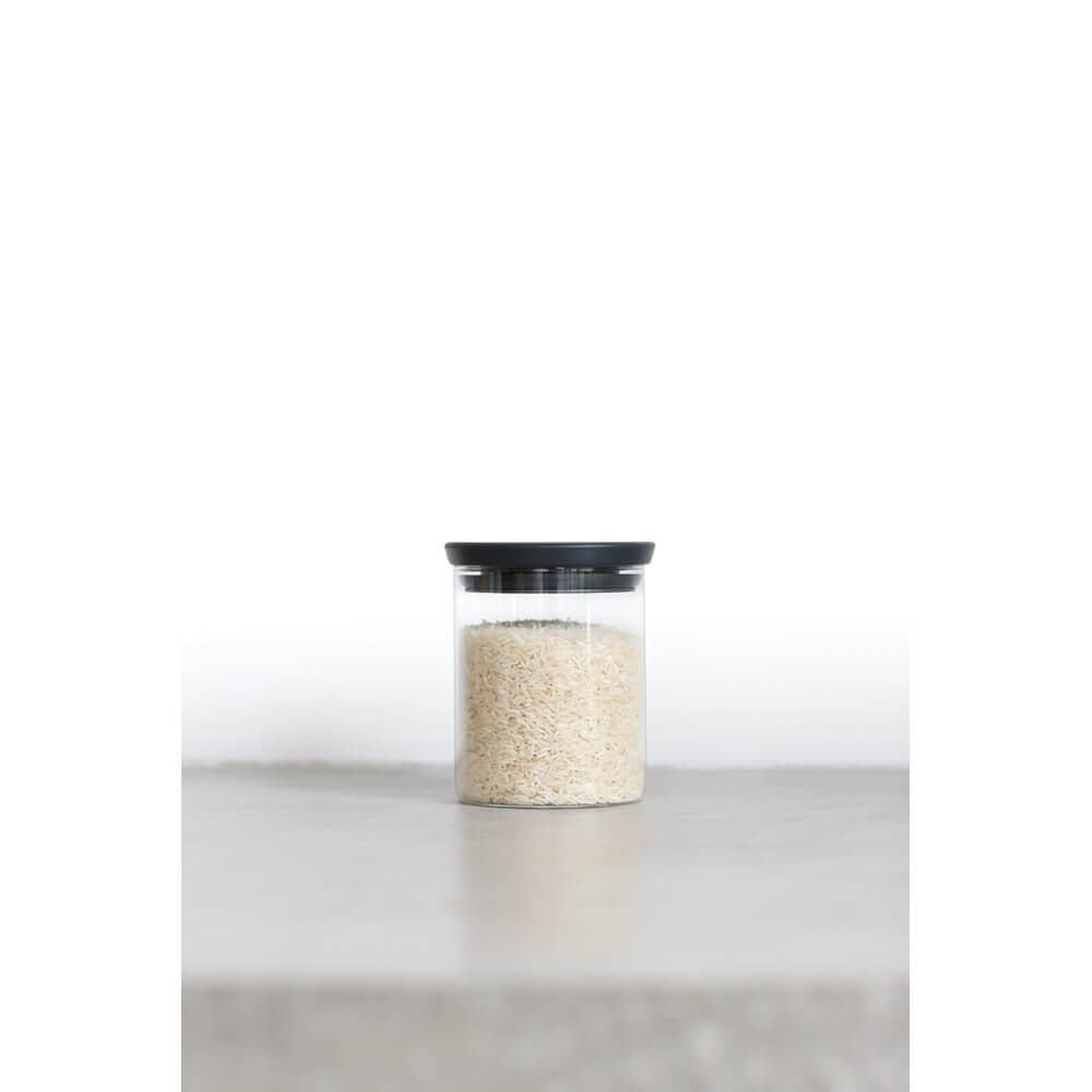 Модульна ємність для зберігання сипучих продуктів Brabantia допоможе вам навести порядок на кухні і запросто знаходити потрібні інгредієнти. Скляна банка не вбирає аромати і легко миється навіть в посудомийній машині. Кришка з пластику щільно прилягає до скла, що створює вакуум, за рахунок цього аромат і смак вмісту буде зберігатися довше. Дизайн модульних банок дозволяє ставити одну ємність на іншу, економити місце на полицях і надійно зберігати крупи, цукор, макарони та інші сипучі продукти. Об'єм ємності — 0,7 л.