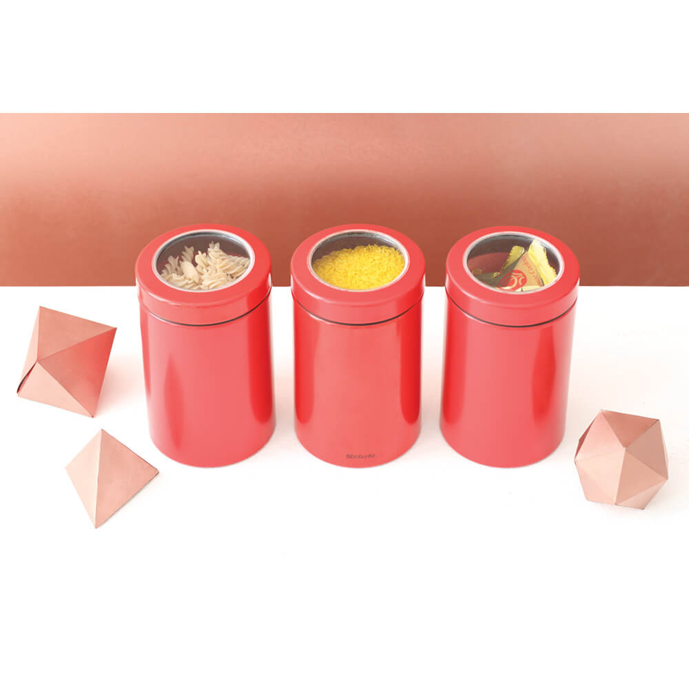 Організувати ідеальний порядок в кухонних шафках сучасної господині допоможе набір контейнерів для зберігання сипучих продуктів від Brabantia. Три практичні та зручні ємності унікальні тим, що мають невеликі віконця, завдяки яким ви завжди будете бачити, що і в якій кількості міститься в банку. Антистатична поверхня запобігає прилипання сипучих продуктів до внутрішньої частини віконця. Спеціальна замикається кришка не пропускає запах, довго зберігаючи аромат і свіжість продуктів. Контейнер виготовлений з антикорозійного сталі із захисним алюмінієво-цинковим покриттям і легко чиститься завдяки гладкій внутрішній поверхні. Контейнер Brabantia об'ємом 1,4 л вміщує 500 г кави або 1 кг цукру. Підстава з захисним покриттям. 10-річна гарантія Brabantia.