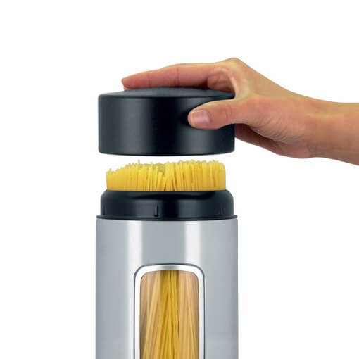 Модульна ємність для зберігання сипучих продуктів Brabantia допоможе вам навести порядок на кухні і запросто знаходити потрібні інгредієнти. Вертикальна форма ідеально підійде для зберігання спагетті і інших видів пасти. Скляна банка не вбирає аромати і легко миється навіть в посудомийній машині. Кришка з пластику щільно прилягає до скла, що створює вакуум, за рахунок цього аромат і смак вмісту буде зберігатися довше. Дизайн модульних банок дозволяє ставити одну ємність на іншу, економити місце на полицях і надійно зберігати крупи, цукор, макарони та інші сипучі продукти. Об'єм ємності — 1,9 л.