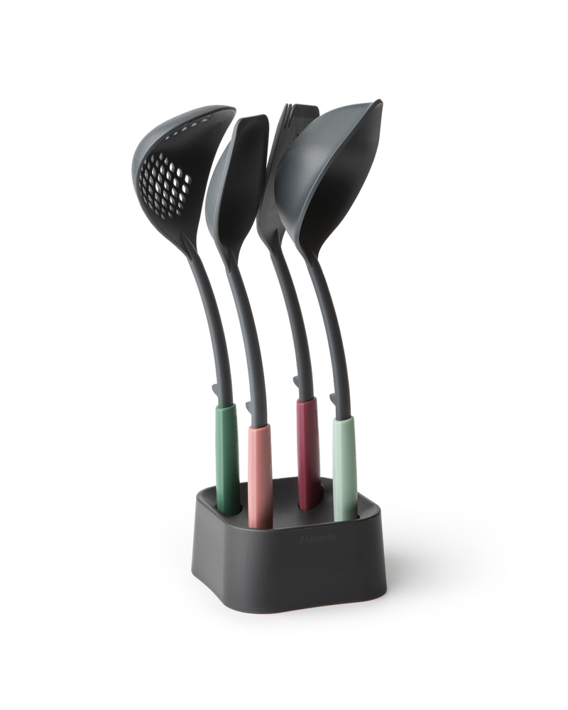 Розташуйте під рукою своїх улюблених кухонних помічників з допомогою цього набору з 4 кухонних приладів. Тримач, в якому знаходяться ополоник зі скребком, сервірувальна ложка з лопаткою, шумівка-ополоник і лопатка-вилка. Це цілих 8 приладь для кухарів, у яких завжди все під контролем!